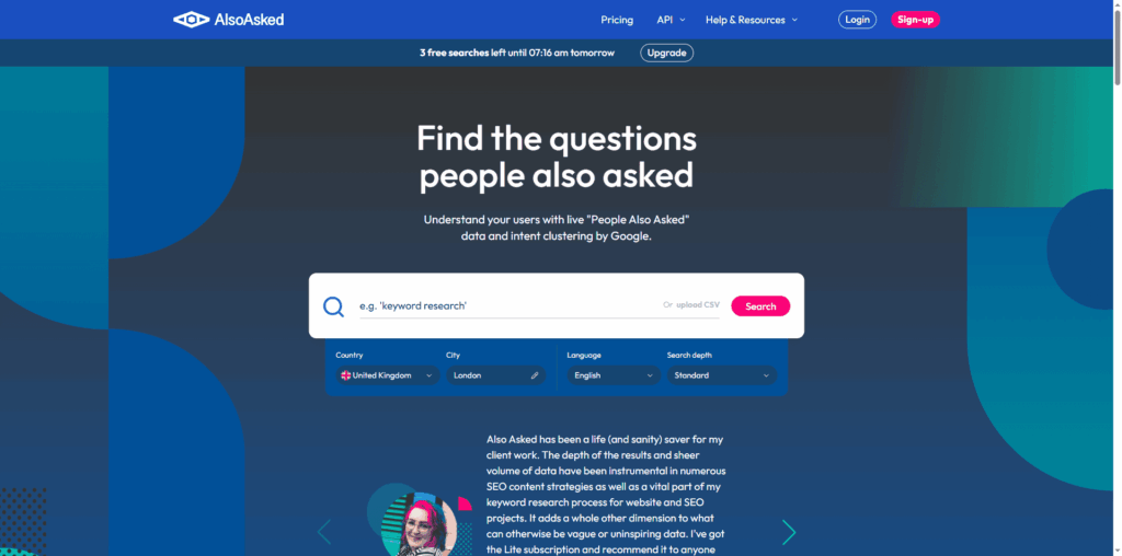 Google Autocomplete shows you real user searches as you type. AlsoAsked.com maps the People Also Ask question clusters around any topic into a visual tree. Together they give you a picture of how real people search for a topic, using Google’s own behavioral data.