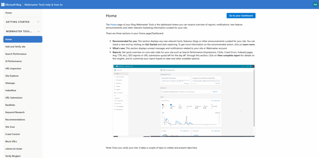 Bing Webmaster Tools shows keyword performance data, crawl statistics, site health reports, and backlink data for your Bing presence. It’s a less comprehensive GSC, and yes, Bing is a smaller search market.