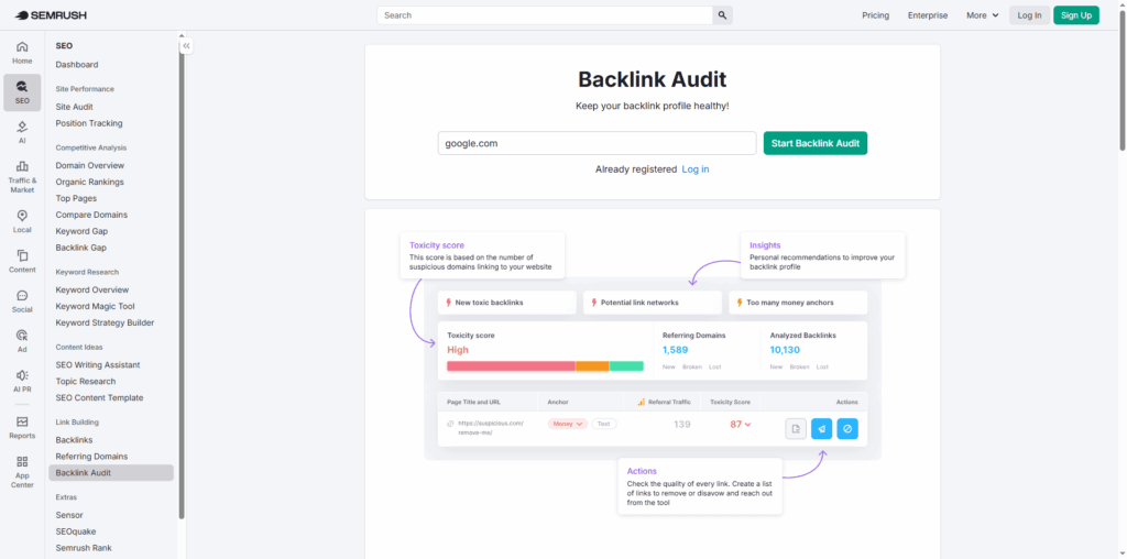 | Semrush Backlink Audit | Backlinks | Included with Semrush | Penalty recovery |